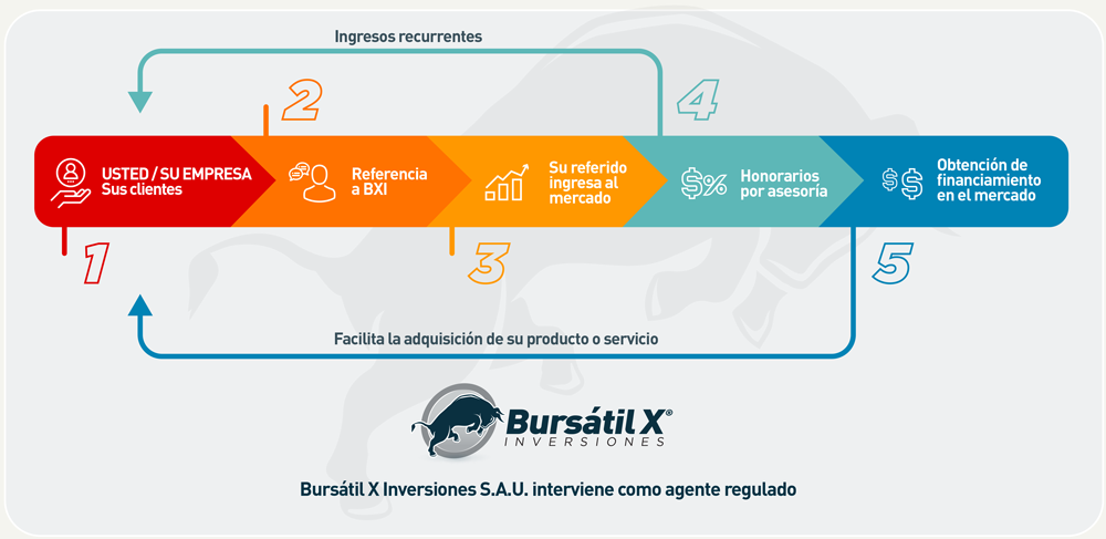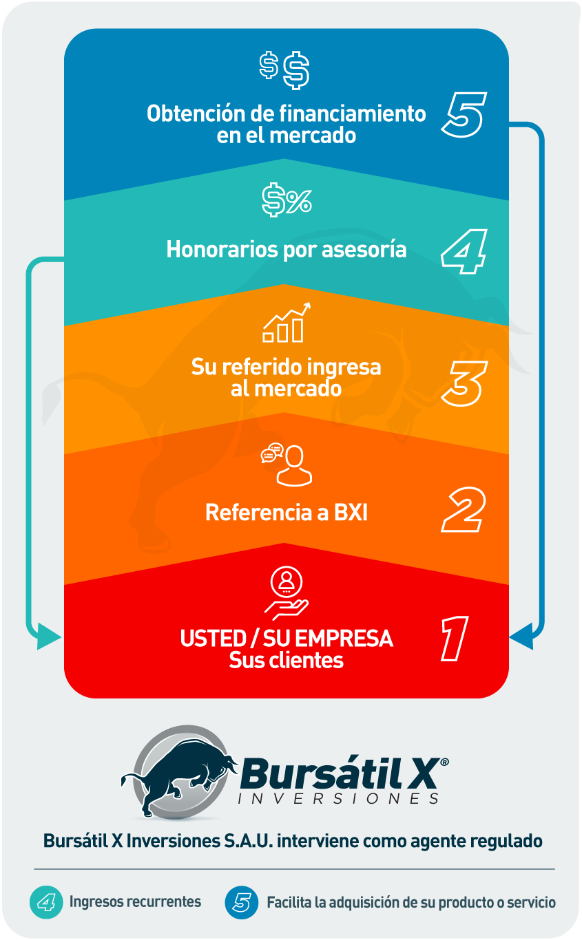 BURSATIL X INVERSIONES S.A.U. en su calidad de Agente Asesor Global de Inversión registrado ante Comisión Nacional de Valores y con la mayor cantidad de convenios firmados en el país ofrece como respaldo la más amplia gama de productos financieros y un exclusivo sistema de seguimiento en la atención al cliente, lo que garatiza la satisfacción y una experiencia de primer nivel para sus referidos.